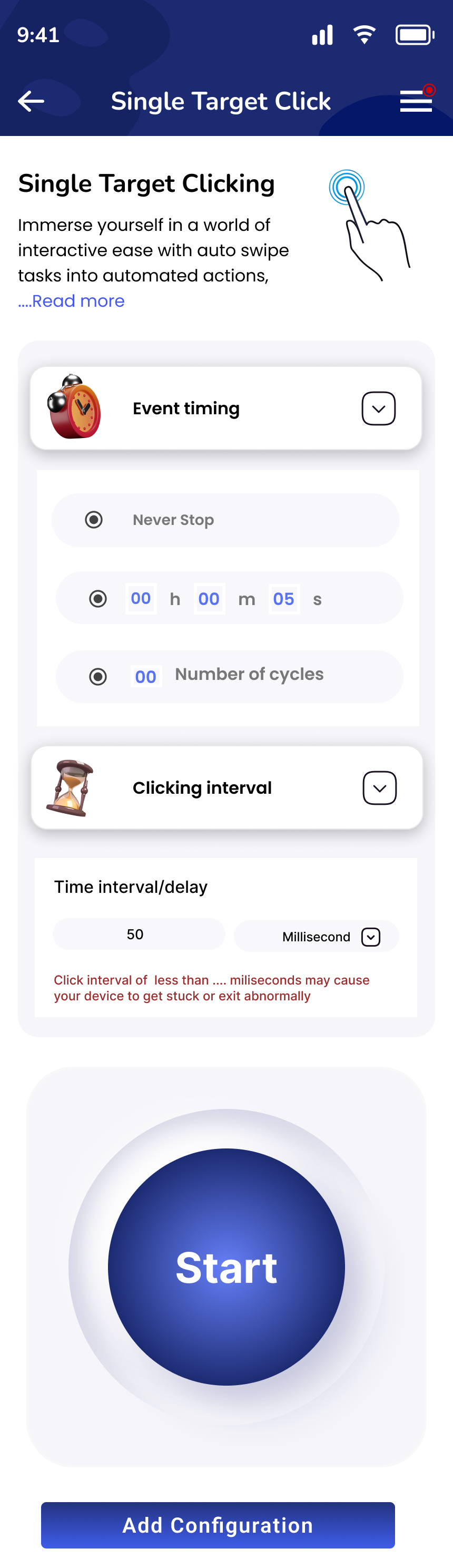 When you tap any feature (like Single Target Clicking), you'll see a configuration screen with these settings:
